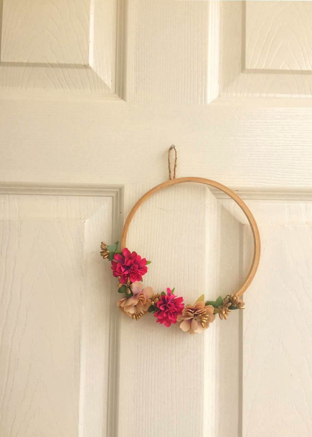 Adorned with faux flowers and leaves, it's surely going to brighten up your doors!